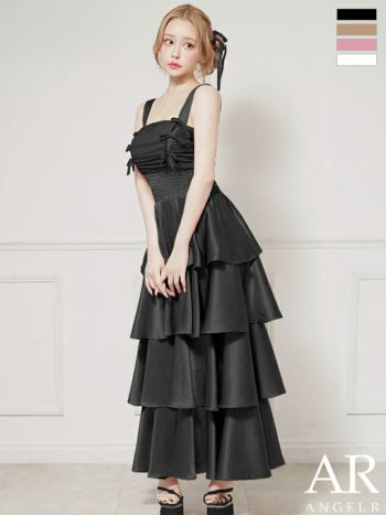 キャバドレス Angel R エンジェルアール リボン フリル ノースリーブ シャーリング ティアード フレアロングドレス