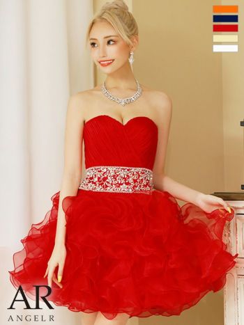 3. 【Angel R/エンジェルアール】ベアトップ ボリューミー スピンドル付き アッパーギャザー ウエストビジュー フレアミニドレス(AR22344)