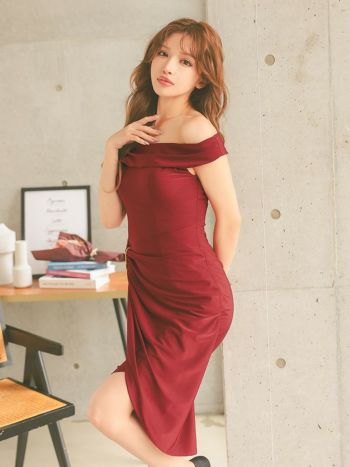 XSあり!艶やかな色気を演出♪ 【Veautt/ヴュート】2way ラップ風 ウエストチャーム ワンカラー オフショルダー 膝丈ドレス (VT022518)