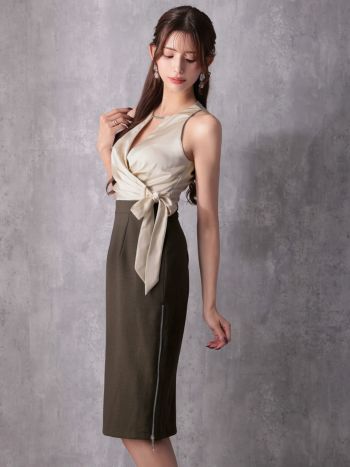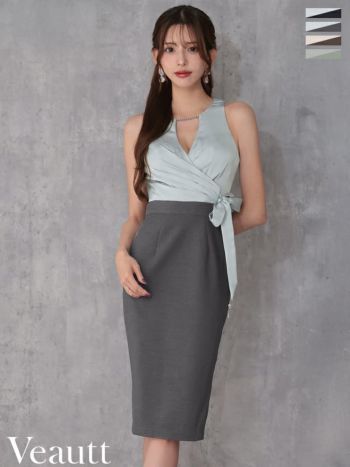 キャバドレス Veautt ヴュート ノースリーブ バストタック チェーン ウエストクロス リボン ジップデザイン バイカラー 膝丈ドレス