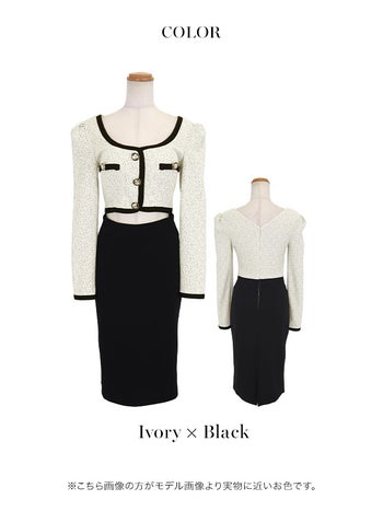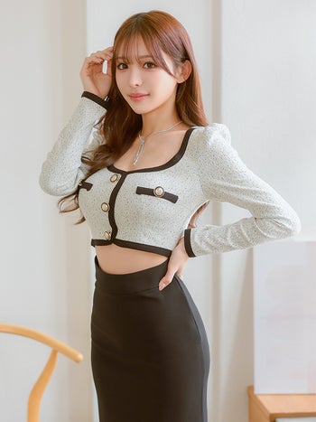 キャバドレス Anella アネラ 長袖 ゴールドボタン ウエストカット パイピング ツイード モノトーン タイト 膝丈ドレス