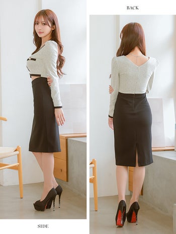 5. 【Anella/アネラ】長袖 ゴールドボタン ウエストカット パイピング ツイード モノトーン タイト 膝丈ドレス