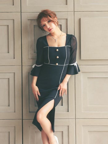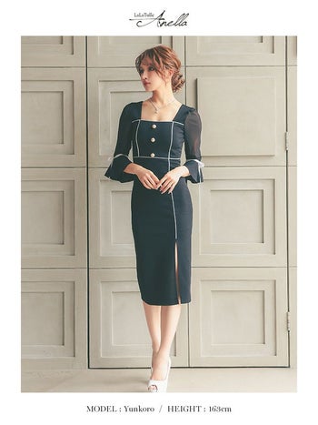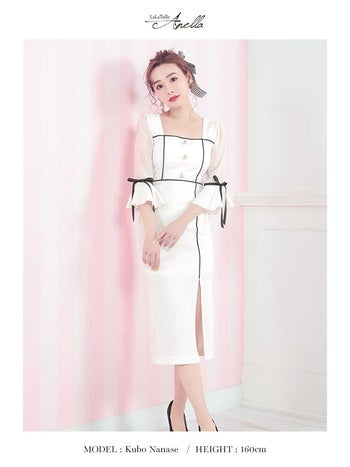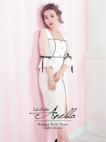 キャバドレス Anella アネラ パフスリーブ モノトーン リボン 袖あり スリット タイト 膝丈ドレス