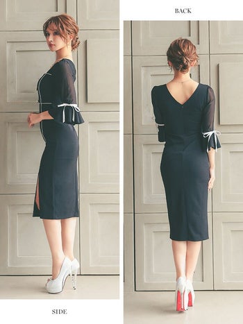 5. SALE【Anella/アネラ】パフスリーブ モノトーン リボン 袖あり スリット タイト 膝丈ドレス