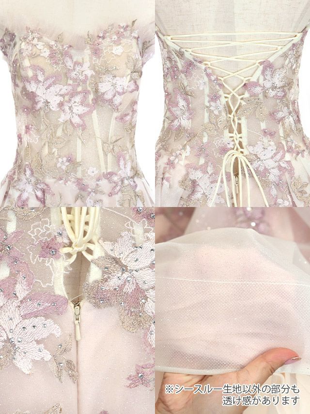 ベア オープンバスト バックレースアップ フラワー刺繍レース チュール ラメ バースデー Aラインロングドレスのスペック表