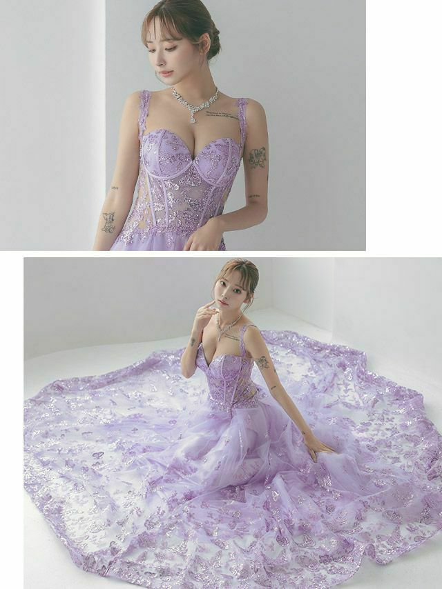 [インポート]バタフライモチーフ キャミソール コルセット風 チュール フレア ロングドレス[Lあり][ラベンダー/スモークブルー]