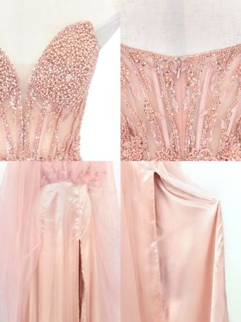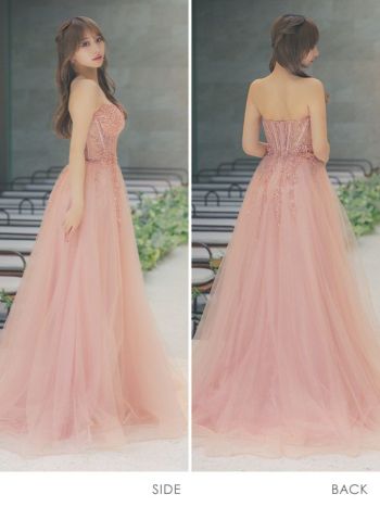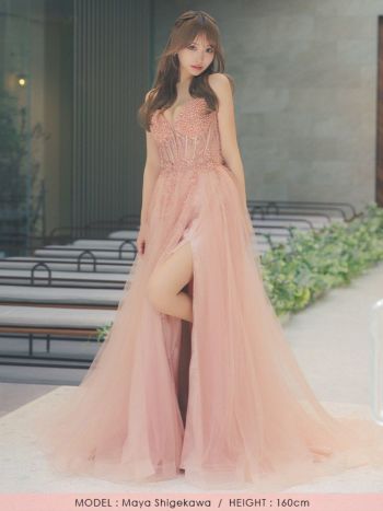 淡いダスティピンクがフェミニン♡ 【LaLaTulle USA/インポート】コルセット ベア ビーズ ビジュー セクシー チュール スリット バースデー Aラインロングドレス