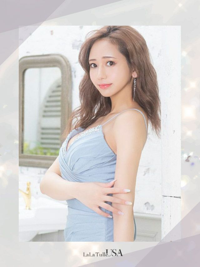 [インポート]サテン ワンカラー ビジュー スリット キャミソール マーメイド タイト 高級ロングドレス[ダスティーブルー][Lあり][天乃えま/キャバドレス着用][888]