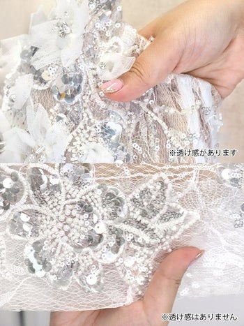 立体感あふれる3Dフラワーや、光を受けて煌めくスパンコールを施し、