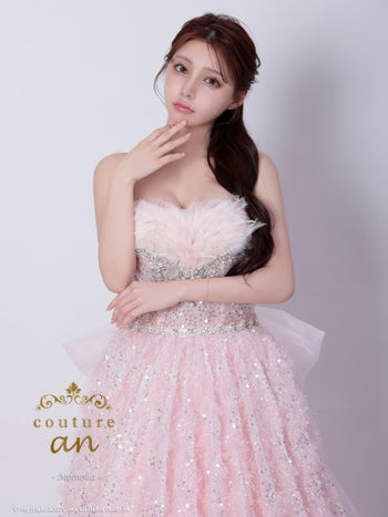 キャバドレス couture an チョーカー付き ベアトップ フェザー バックリボン スパンコール バースデー Aラインロングドレス