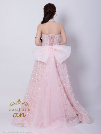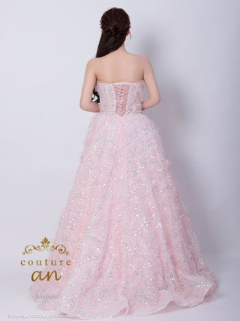 後ろ姿まで可愛いを演出♪ 【couture an/クチュール アン】チョーカー付き ベアトップ フェザー バックリボン スパンコール バースデー Aラインロングドレス(aocwd045)