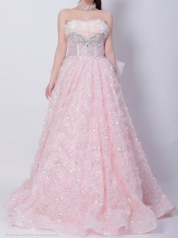チョーカー付き ベアトップ フェザー バックリボン スパンコール バースデー Aラインロングドレスの全身フロント画像1
