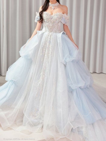 ガーリー オフショルダー チョーカービーズ スパンコール ビジュー バースデー フリル ロングトレーン Aラインロングドレスの全身フロント画像1