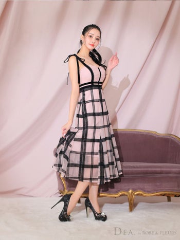 4. 【DEA.by ROBE de FLEURS/ディア】キュート キャミソール チェック チュールフレア リボン Aラインロングドレス(DE3313)