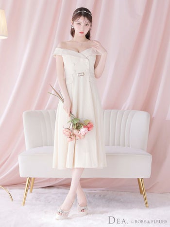 Lあり!ふんわりチュールが愛されシルエットに♡ 【DEA.by ROBE de FLEURS/ディア】オフショルダー ダブルボタン プリーツ チュール バックル Aラインロングドレス(DE3417)
