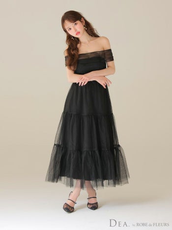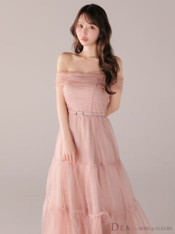 4. 【DEA.by ROBE de FLEURS/ディア】オフショルダー ウエストベルト ラメチュール ティアードスカート フェミニン Aラインロングドレス(DE3481)