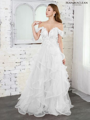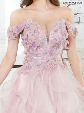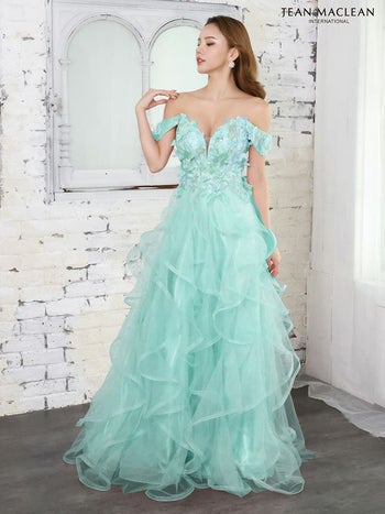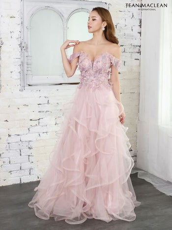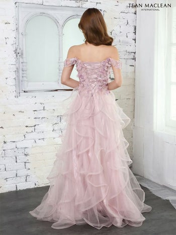 4. 【JEANMACLEAN/ジャンマクレーン】立体フラワーモチーフ オフショルダー チュールレース ワンカラー フレアロングドレス(41616)