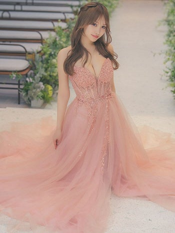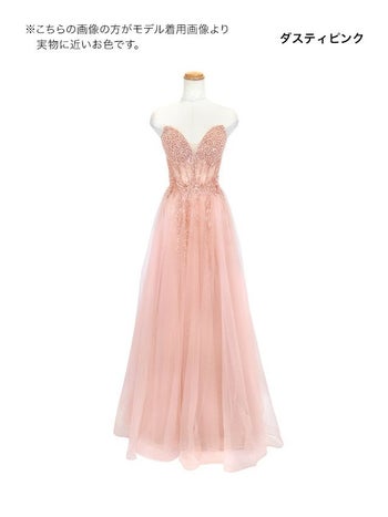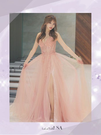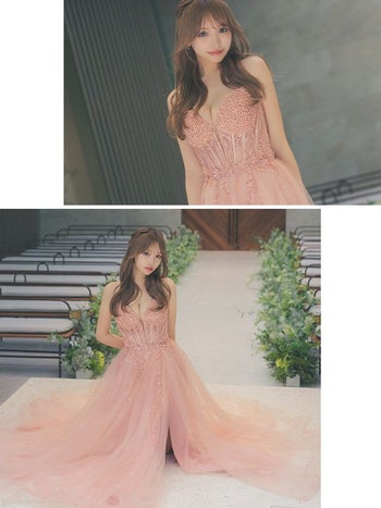 淡いダスティピンクがフェミニン♡ 【LaLaTulle USA/インポート】コルセット ベア ビーズ ビジュー セクシー チュール スリット バースデー Aラインロングドレス