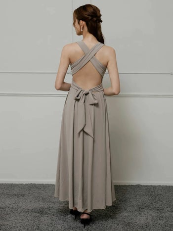 4. 【Veautt/ヴュート】Vカット バックオープン リボン ウエストクロス ワンカラー ノースリーブ Aラインロングドレス(VT022525)