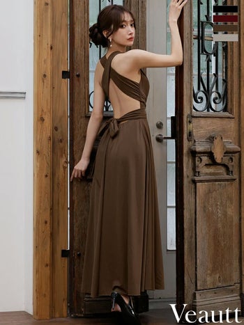 4. 【Veautt/ヴュート】バックオープン リボン Vカット ウエストクロス ワンカラー ノースリーブ Aラインロングドレス(VT022525)