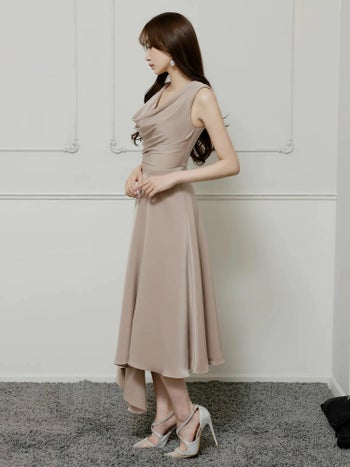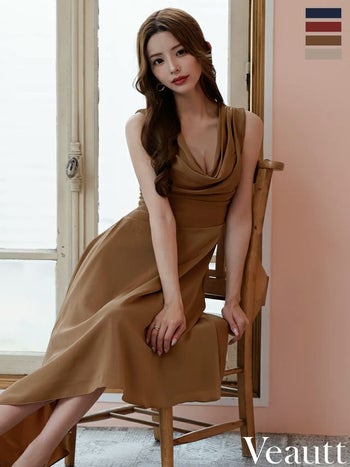 4. 【Veautt/ヴュート】ノースリーブ バストドレープ エレガント アシンメトリー ワンカラー シンプル Aラインロングドレス(VT022526)
