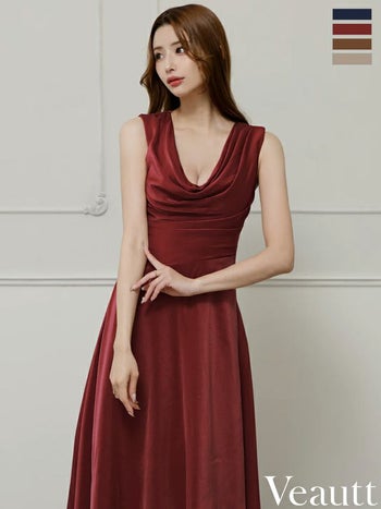 3. 【Veautt/ヴュート】ノースリーブ バストドレープ シンプル アシンメトリー エレガント ワンカラー Aラインロングドレス(VT022526)