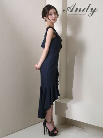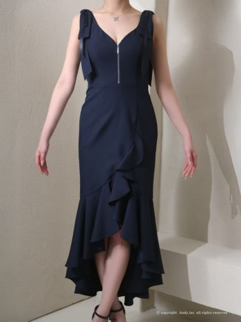 キャバドレス Andy ジップデザイン ショルダーリボン フリル ノースリーブ ワンカラー ロングテールドレス