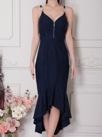 キャバドレス an ガーリー ジップデザイン キャミソール 裾フリル フラワー チャーム ドット柄 ロングテールドレス
