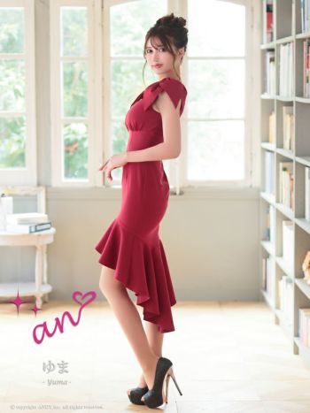 キャバドレス ミディアムドレス an アン ワンカラー リボン ジップデザイン 裾フリル テールカット ノースリーブ 膝丈ドレス