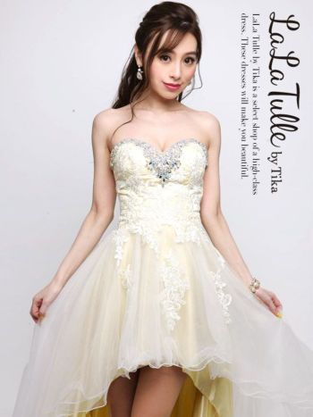 爽やかな雰囲気のグラデーションカラーと裏地がレモンイエローのオシャレなロングテールドレスが2パターン♪