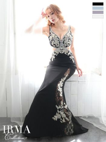 3. 【IRMA/イルマ】キャミソール バック編み上げ セクシー レース ワンカラー フラワービジュー サイドウエストカット シアー タイトロングドレス(31353)