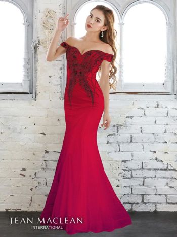 美しいビジュモチーフのオフショルダーのレッドのロングドレス。