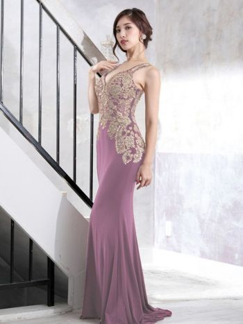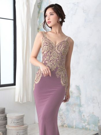 デザイン刺繍がラグジュアリーなワンカラーロングドレス。