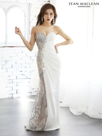 【JEANMACLEAN/ジャンマクレーン】スパンコールレース刺繍ネット サイドシースルー タイトロングドレス[アイボリー]