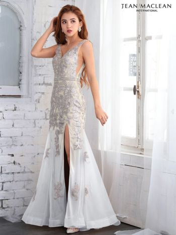 4. 【JEANMACLEAN/ジャンマクレーン】フラワー刺繍デザイン×シフォンチュール マーメイド タイトロングドレス[アイボリー]