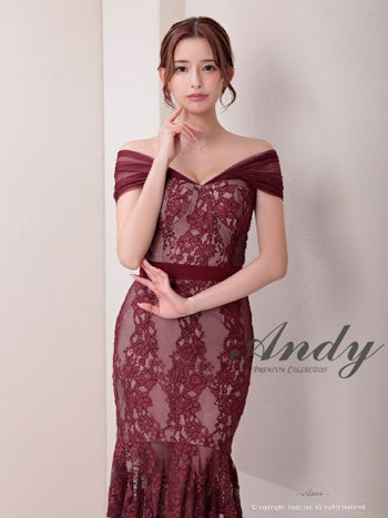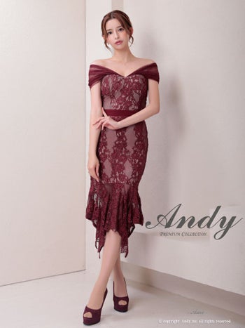 3. 【Andy/アンディ】オフショルダー ワンカラー フラワーレース テールカット リボン シアー マーメイド 膝丈ドレス(anon2861)