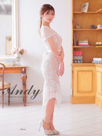 キャバドレス ミディアムドレス Andy アンディ オフショルダー ワンカラー フラワーレース テールカット リボン シアー マーメイド 膝丈ドレス
