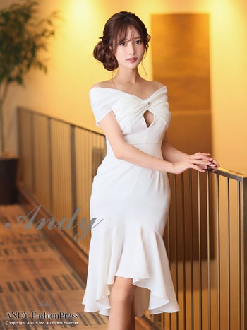 キャバドレス ミディアムドレス Andy アンディ ワンカラー マーメイド フリル カットアウト テールカット オフショル 膝丈ドレス
