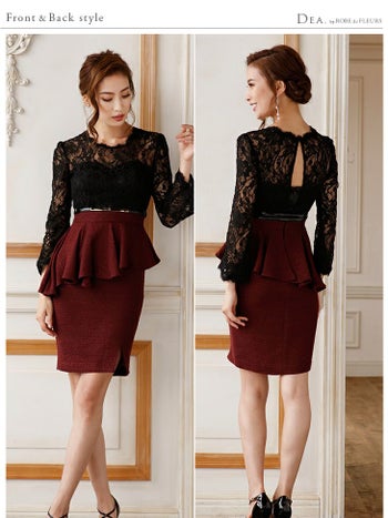 大人かわいいフェミニンな高級キャバ ワンピース♪ 【DEA.by ROBE de FLEURS/ディア】レース×ラメツイード ペプラム長袖 タイトひざ丈ドレス[ブラック×グレー][Lあり][1226]