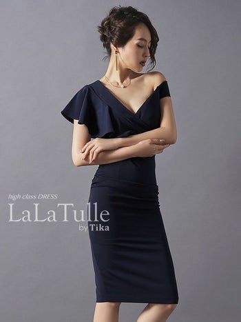 キャバドレス LaLatulle ララチュール アシメ フリルショルダータイトミディドレス(3color)(S/M/L)(青田夏奈 着用)【送料無料】