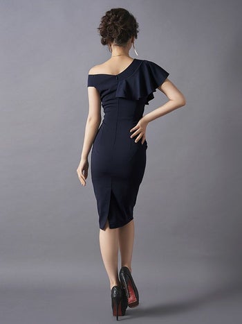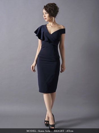 3. アシメ フリルショルダー タイトひざ丈ドレス[3color][Lあり][青田夏奈/キャバドレス着用]