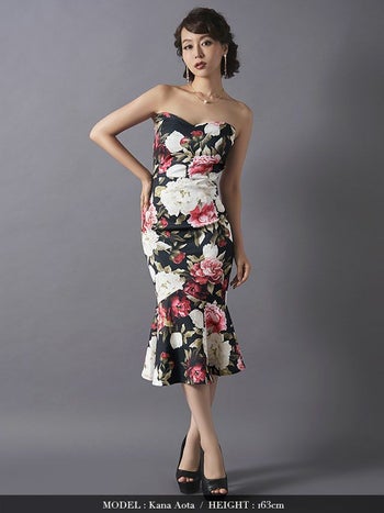 高品質な大人綺麗なキャバドレス♪ フラワープリント ベアトップ タイトひざ丈ドレス[ブラック][青田夏奈/キャバドレス着用]
