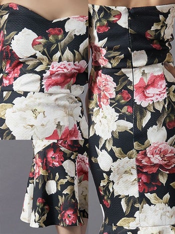 3. フラワープリント ベアトップ タイトひざ丈ドレス[ブラック][青田夏奈/キャバドレス着用]