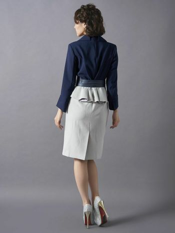 高品質な大人綺麗なキャバドレス♪ [韓国ドレス][LaLaTulle]ブラウス風 ペプラムリボン バイカラー 袖あり タイトひざ丈ドレス[ネイビー×グレー][Lあり][青田夏奈/キャバドレス着用]
