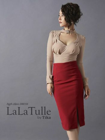 キャバドレス LaLatulle ララチュール  胸元カットデザインバイカラー長袖タイトミディアムセットアップドレス (ワインレッド/ブラック) (Sサイズ/Mサイズ) (青田夏奈 着用)【送料無料】
