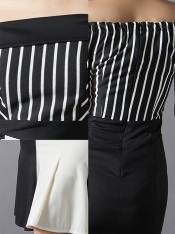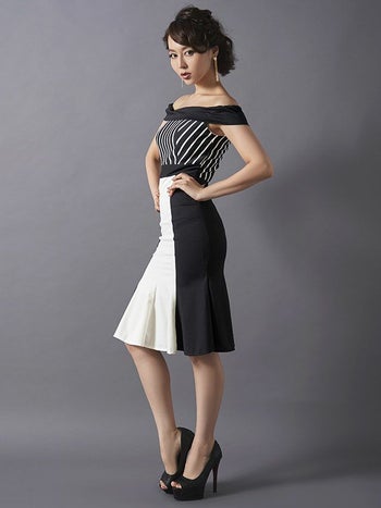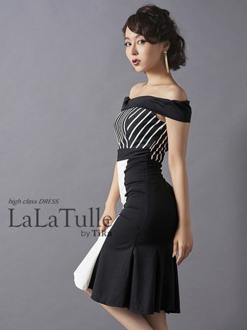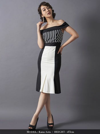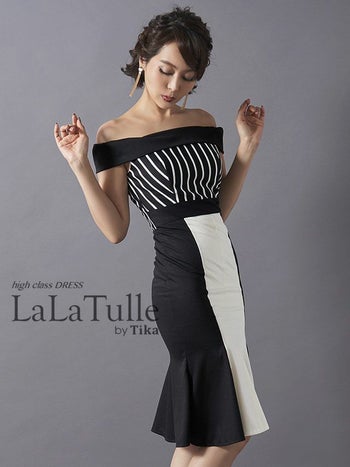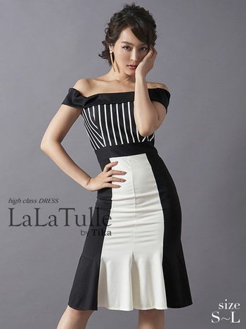 alt="キャバドレス LaLatulle ララチュールモノトーンストライプオフショルダーミディドレス(1color)(S/M/L)(青田夏奈 着用)">