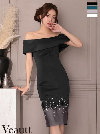 キャバドレス Veautt ヴュート オフショルダー フラワーレース ビジュー シアー切替 エレガント 膝丈ドレス