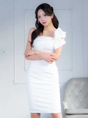 キャバドレス Veautt ヴュート バックスリット パールストラップ付き ワンショルダー ビッグリボン フェミニン 膝丈ドレス