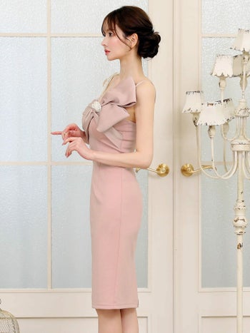 4. 【Veautt/ヴュート】バックスリット パールストラップ付き ワンショルダー ビッグリボン フェミニン 膝丈ドレス (VT082508)