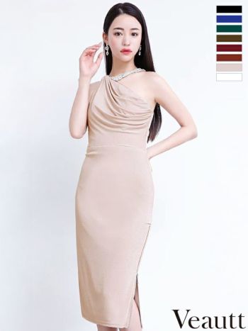3. 【Veautt/ヴュート】ジップデザイン スリット タイト シンプル ドレープデザイン ネックビジュー エレガント ミディアム ひざ丈ドレス(VT11232)